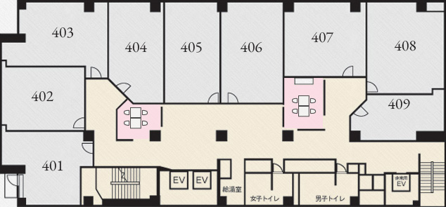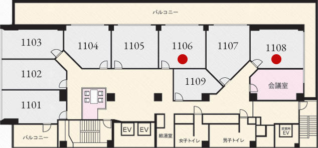 料金から選ぶ 部屋のタイプから選ぶ サービス内容から選ぶ オフィス情報OFFICE トップページ > オフィス情報 PRICEご利用料金 305 502 1106 1108 契約面積 42.50m² 37.95m² 27.42m² 25.71m² ご利用人数 6〜8名 6〜8名 4〜5名 4〜5名 利用料 167,440円 149,500円 116,340円 109,060円 電気空調基本料 28,100円 25,000円 17,900円 16,800円 月額固定費 195,540円詳細をみる 174,500円詳細をみる 134,240円詳細をみる 125,860円詳細をみる ※横スクロールでご覧いただけます。 OFFICEオフィス情報 3F 4F 5F 6F 11F 1F 3F ※ 赤丸をクリックするとお部屋の詳細情報をご覧いただけます。 3F エレベーター前ディスプレイ 3F ミーティング&レストスペース 4F 4F ゆったりとした共有空間 4F ミーティング&レストスペース 5F ※ 赤丸をクリックするとお部屋の詳細情報をご覧いただけます。 5F エレベータ前ホール 5F ミーティング&レストスペース 6F 6F エレベータ前ホール 6F ミーティング&レストスペース 11F ※ 赤丸をクリックするとお部屋の詳細情報をご覧いただけます。 11F エレベータ前ホール 11F ミーティング&レストスペース 1F 1F ビル玄関 1F エントランス 1F フロント